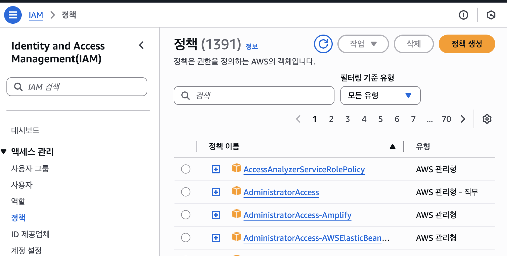 AWS Console > IAM > 액세스 관리 > 정책 > 정책 생성