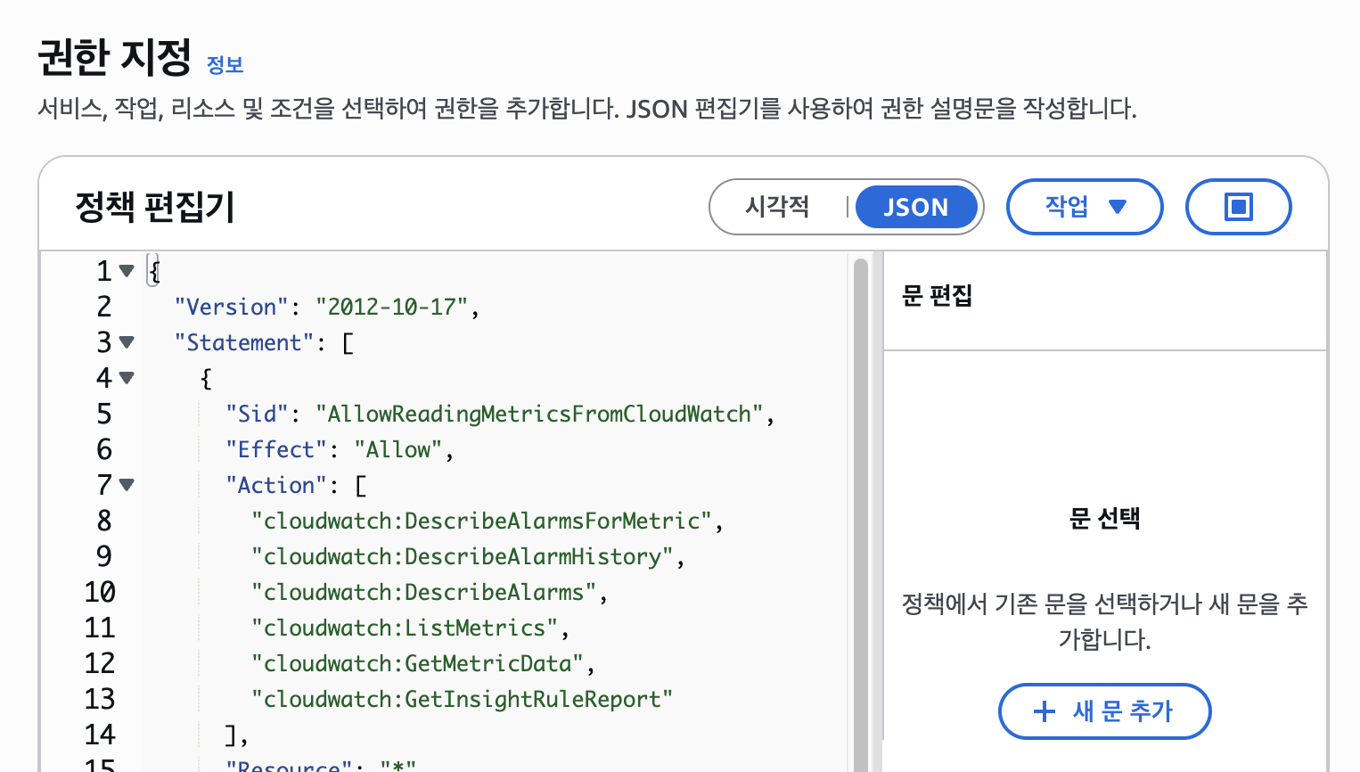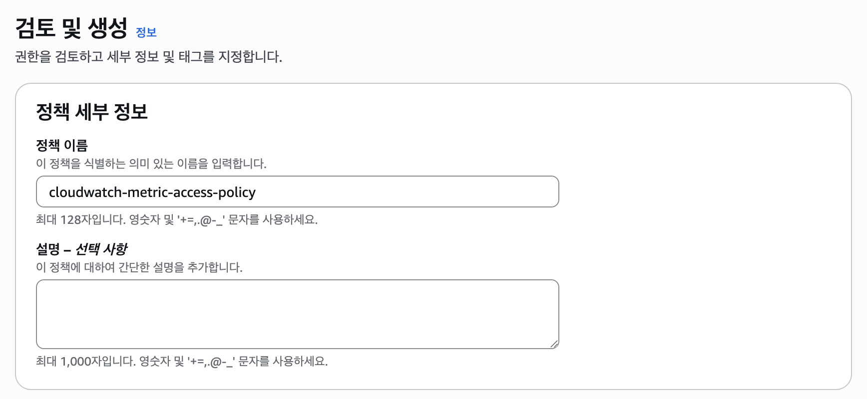 CloudWatch Metrcis에 접근할 수 있는 JSON 정책을 기입 후, 다음