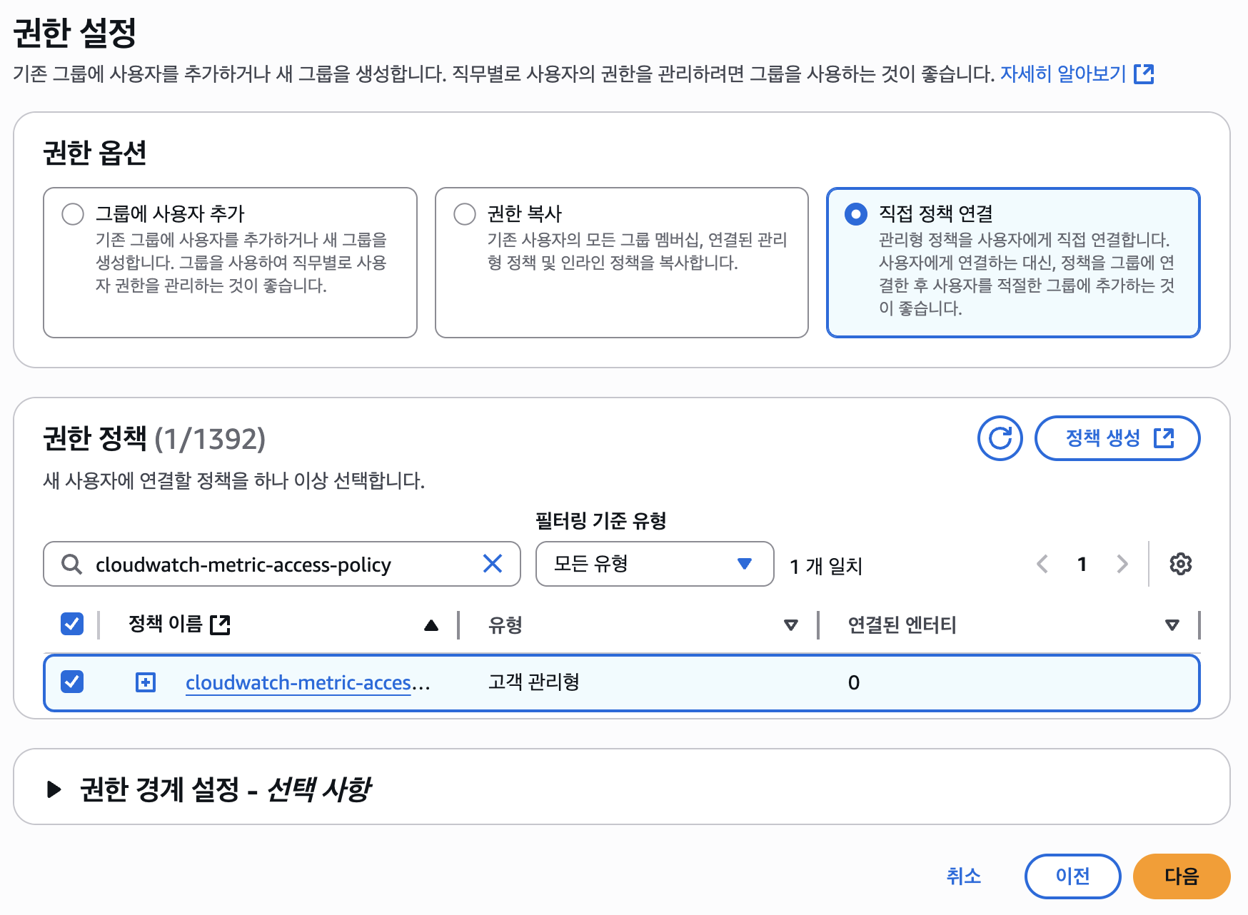 을 선택 후, 앞서 만든 IAM 정책을 선택하고 다음을 선택합니다.
