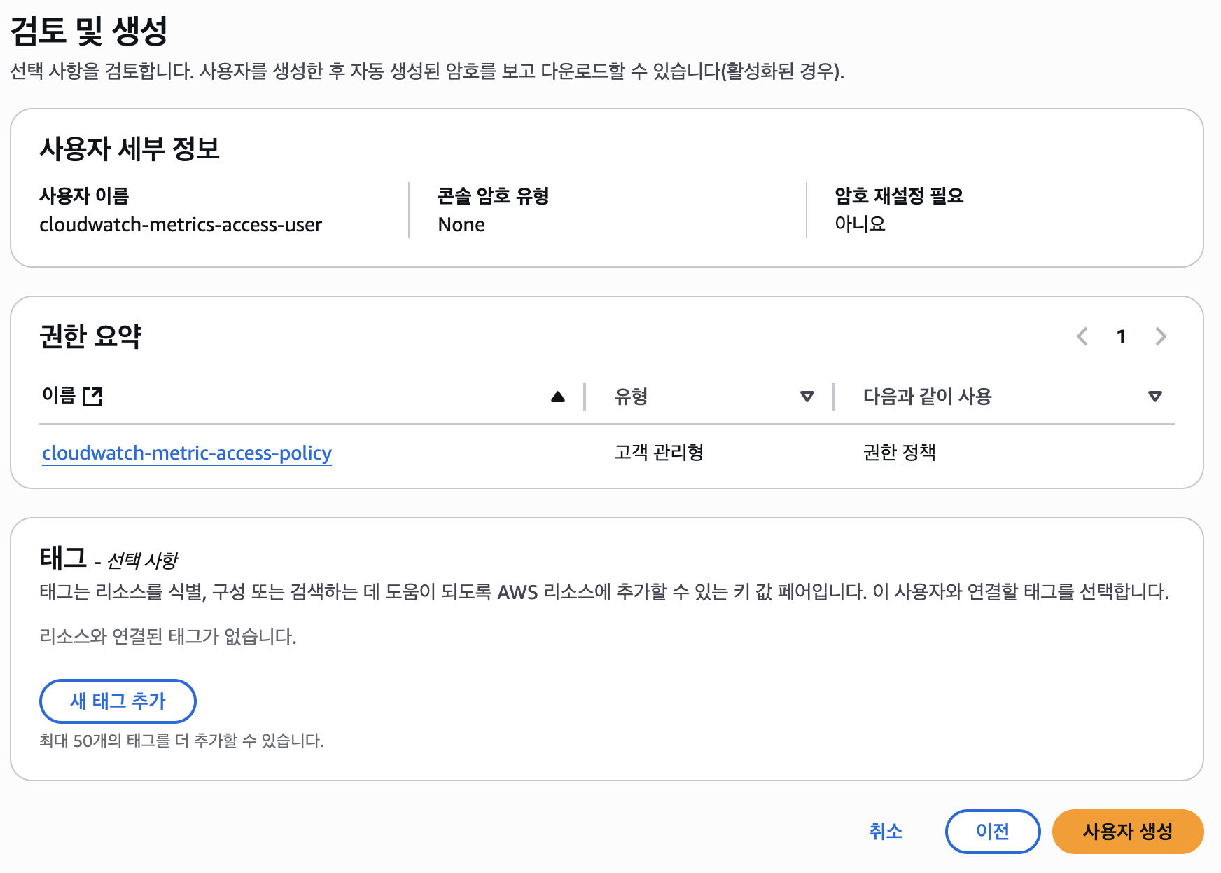 생성되는 IAM 사용자의 이름, 연결된 정책이 올바른지 확인하고 사용자 생성