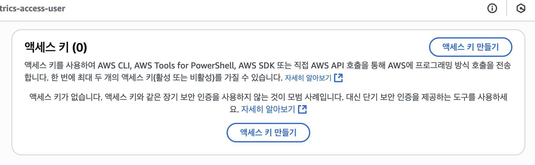 AWS Console > IAM > 액세스 관리 > 사용자 > 방금 만든 사용자 선택 > 보안 자격증명