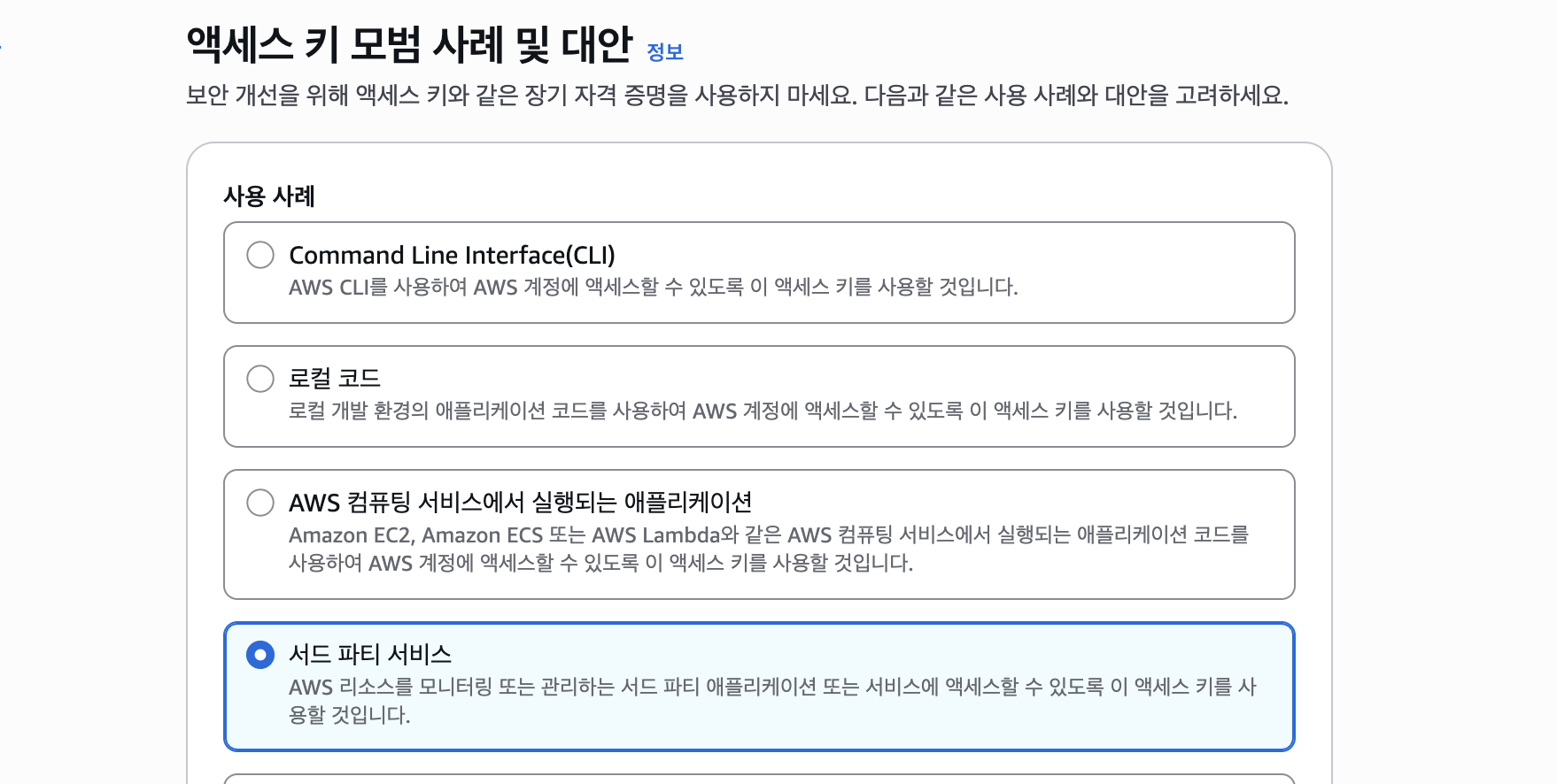 를 선택합니다. 또한, “위의 권장 사항을 이해했으며 액세스 키 생성을 계속하려고 합니다”에 동의하고 다음